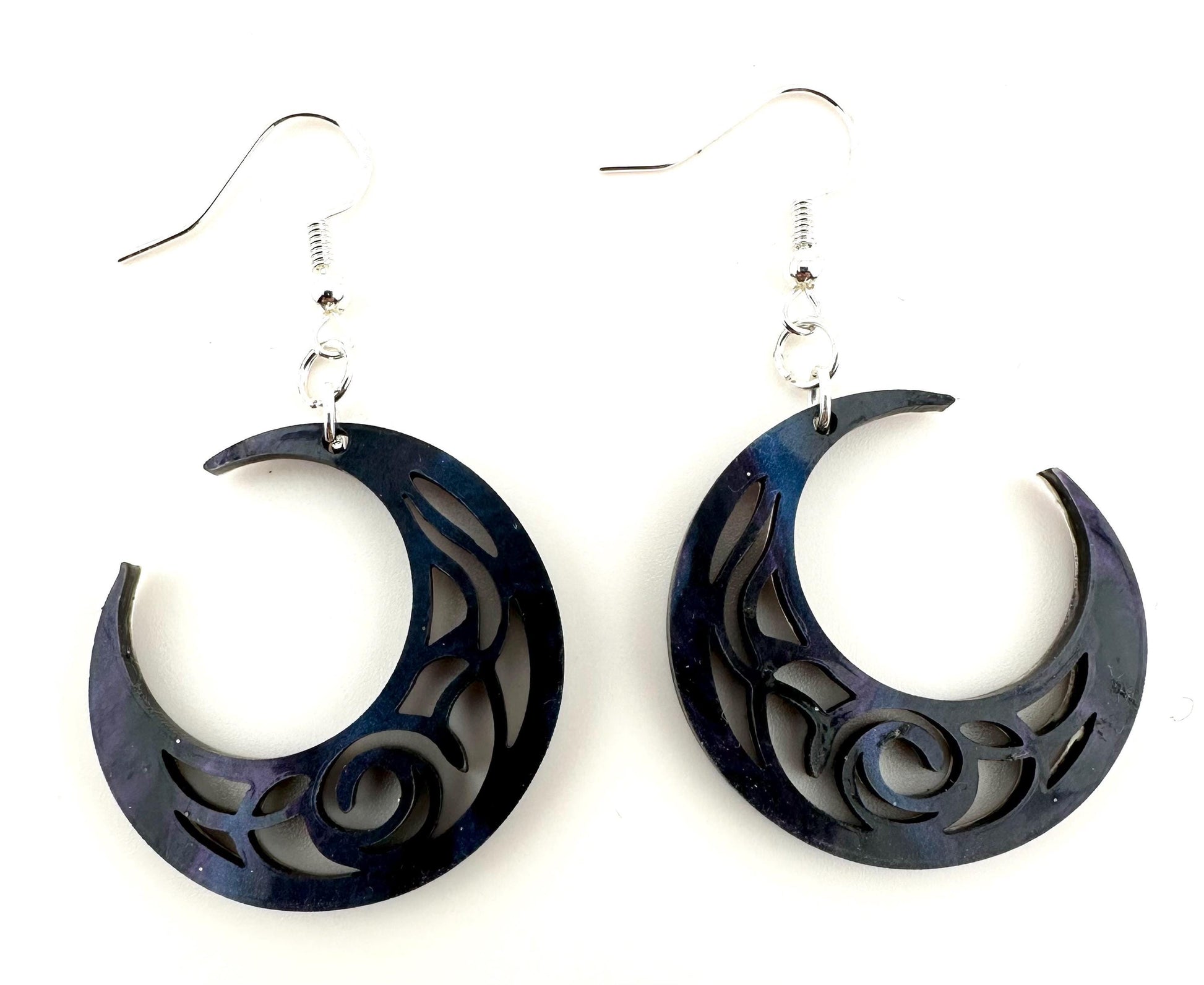 Bring a touch of the cosmos to your everyday look with these galaxy-inspired crescent moon earrings. Each pair is laser cut from high-quality acrylic with mesmerizing swirls of deep purple, black, and silver — creating a one-of-a-kind celestial pattern that catches the light beautifully.