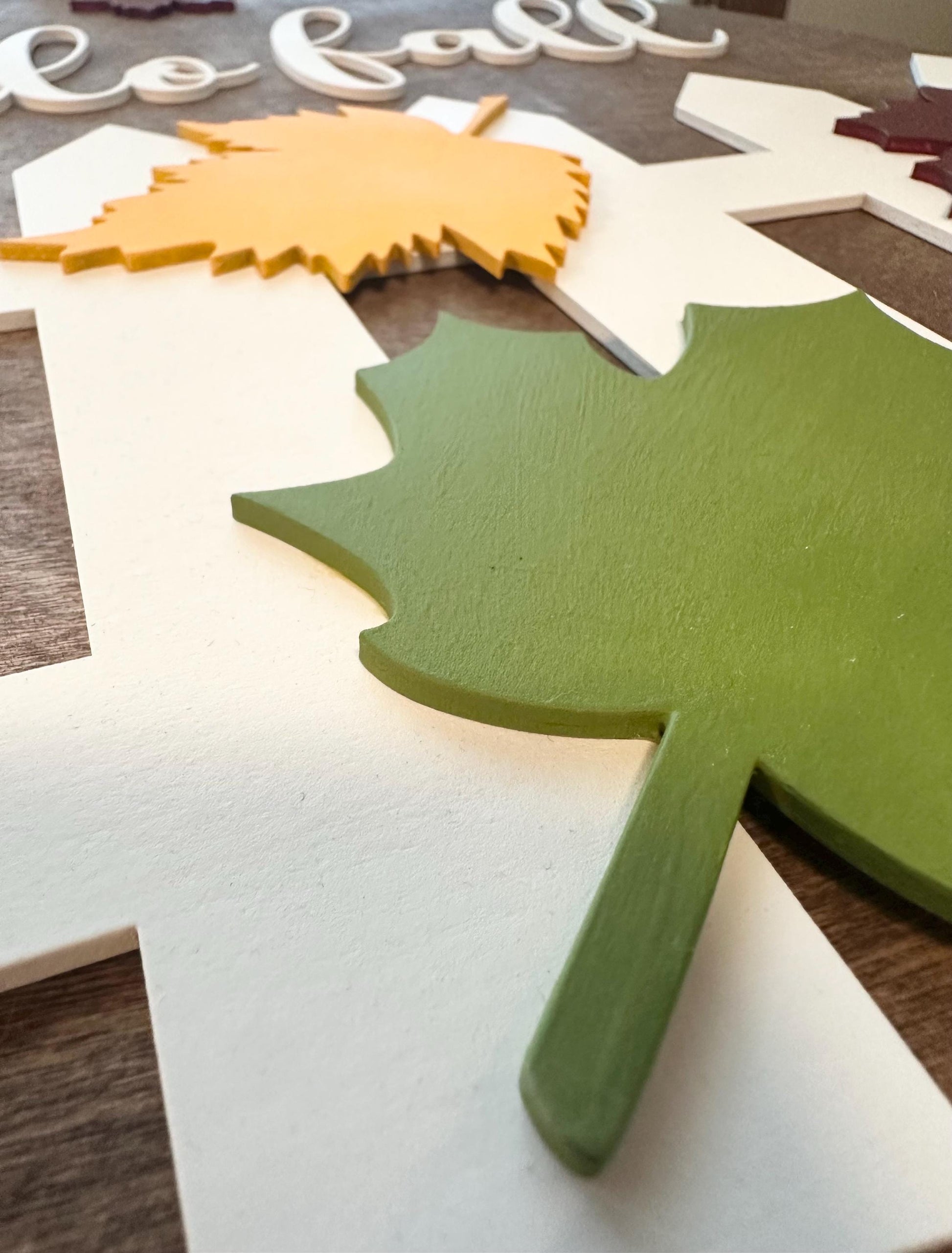 Each sign features a warm brown stained background, white picket fence, and colorful layered leaves — a perfect rustic farmhouse accent for your front door, porch or inside your home.