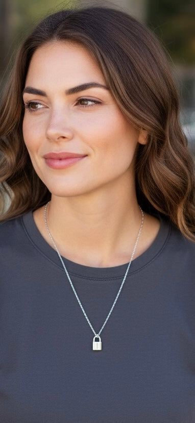 This elegant padlock necklace features a sleek silver lock on a delicate chain, designed to be worn beautifully on its own or personalized with engraved initials. A subtle statement piece that symbolizes love, commitment, and connection.