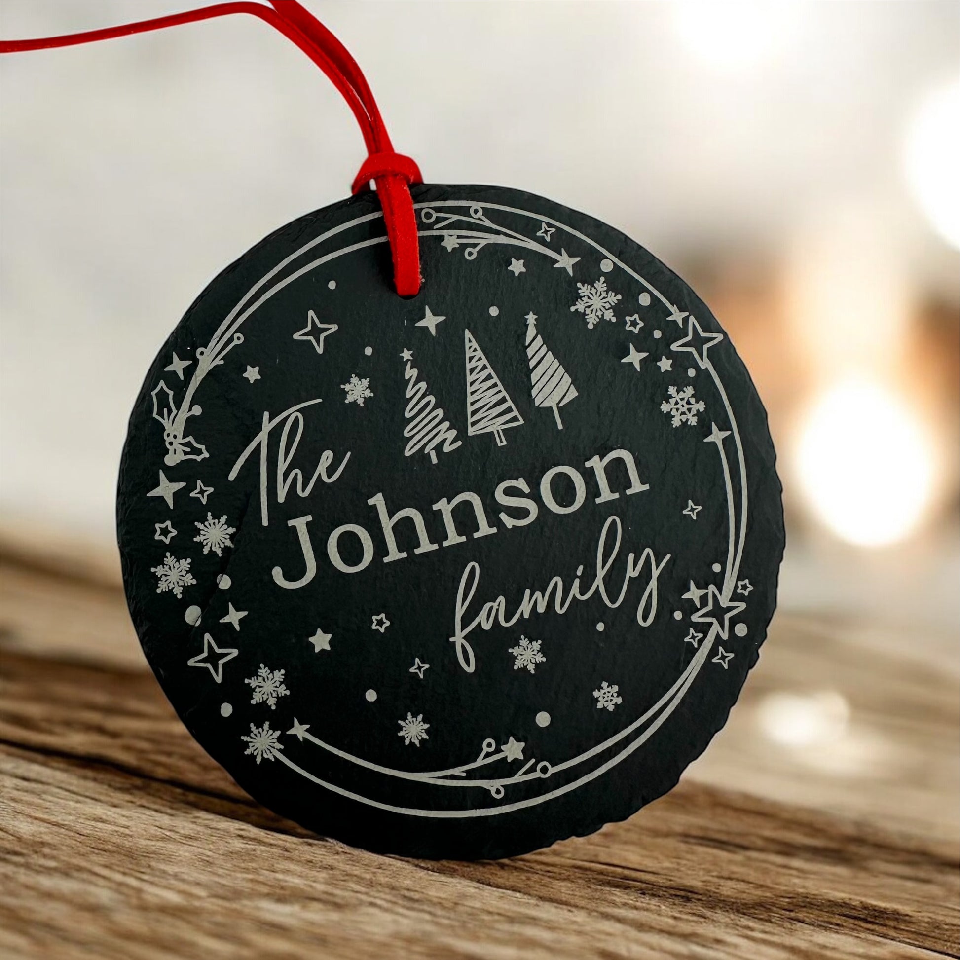 Each ornament features a charming woodland design with snowflakes, stars, and trees surrounding your custom family name.