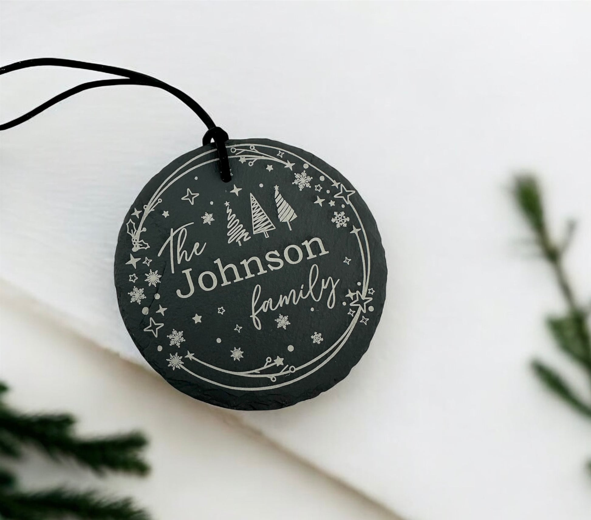 Celebrate the magic of the season with a beautiful slate ornament customized with your family name.